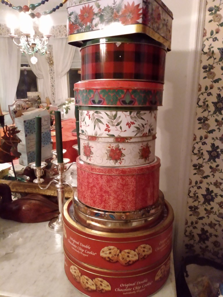 The Swiss Colony is still going strong, and the goodies they sell for the holidays and year-round are as wonderful as ever. But when it comes to Christmas cookies, there’s nothing like making your own. A few years ago, wanting to conserve table space, I took up piling all the tins of homemade Guinther specialties into a V.I.P. tower of our own. This year, although we made the same lineup of cookies as usual, the tower seemed particularly imposing, and I thought we could give the catalogues a run for their money.