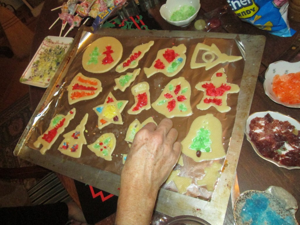 Every baker who celebrates Christmas has his or her signature cookie collection. My family makes 9 varieties, some quick and easy, some requiring artistic creativity and a massive time commitment. The most fun (and complicated) are the stained-glass window cookies, made with hard-candy crumbs that melt in the oven as the cookies bake. The recipe was a clever invention of the Life Saver company some time in our early youth. We actually still have the official printed piece of paper. (Wonder what that would be worth on the Antiques Road Show.) The window cookies get the prize for degree of difficulty, beauty and messiness. In all these decades of making them, we have come up with no better method of crushing the candies than whacking them with a hammer. As you may imagine, this shoots tiny shards of sugar all over the kitchen. In the early years, we mostly stuck with the simple recommended patterns that came with the recipe, but over the years, the designs have gotten more and more elaborate. My father used to make cathedral-like rose windows, and we’ve even gone so far as to represent a triptych with manger scene.
